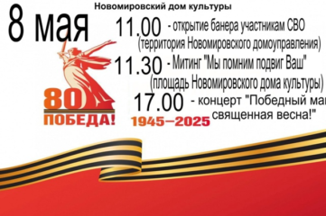 На площади Новомировского дома культуры прошел торжественный митинг, посвященном 80-летию Великой Победы! Великая Отечественная война – это не просто страницы истории. Это боль и скорбь каждой семьи, это подвиг, который не меркнет в памяти поколений. Мы помним тех, кто сражался … Читать полностью