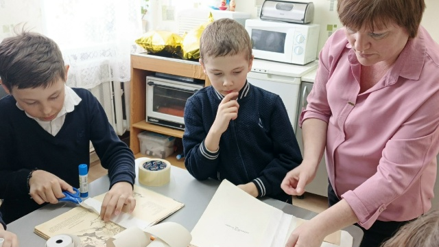Вооружившись ножницами, клеем, скотчем и бумагой, дети приступили к работе. Ребята расправляли загнувшиеся страницы, подклеивали корешки и обновляли обложки. Каждый старался выполнить работу аккуратно и качественно